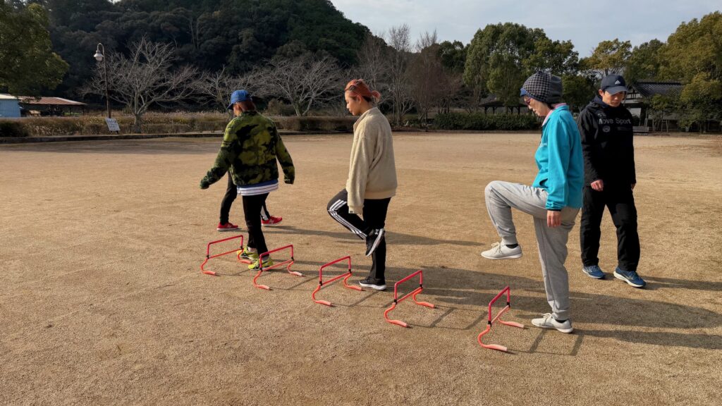 いつものミニハードルのあとはヨガマットを敷いての体幹トレーニング、今日はプランクです。前と横向きで保持やら足上げなど、キツイです