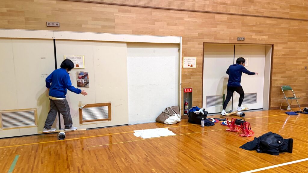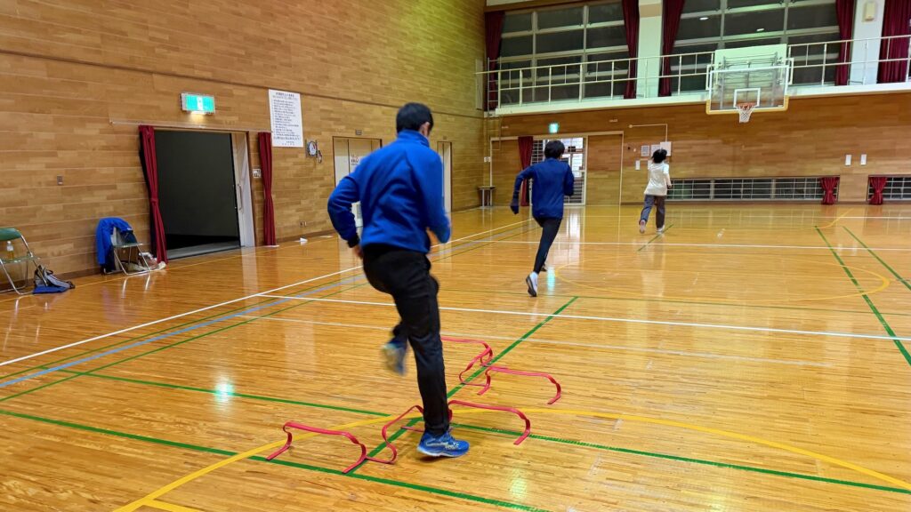 アップからメインのミニハードルを行った後は、筒バランスで体幹トレーニングです。グラグラをできるだけ耐えてインナーマッスルを鍛えます。あとはリング走で神経系の運動を行い、最後はストレッチで終わりました。